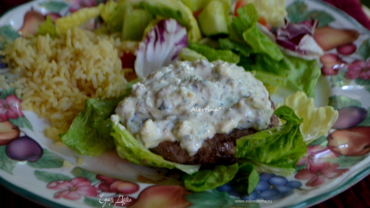 Подаем котлеты с салатными листьями и греческим соусом тцадзики. Приятного аппетита.