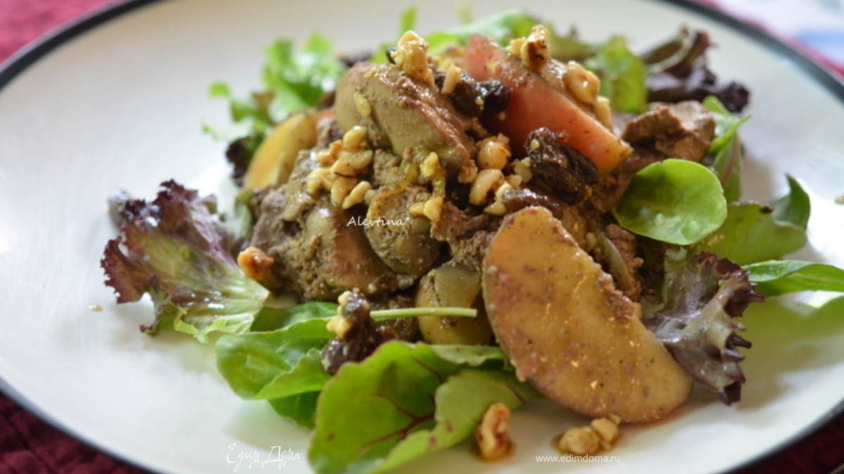 Теплый салат с куриной печенью и яблоком
