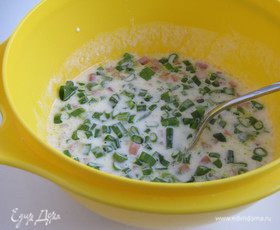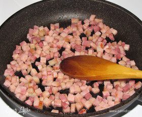 Нарезать ветчину маленькими кубиками и обжарить до золотистого цвета на оливковом масле. Зеленый лук нарезать тонкими колечками.