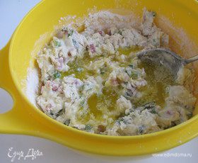 В несколько приемов всыпать муку, хорошо размешивая. Влить растопленное сливочное масло и замесить тесто.