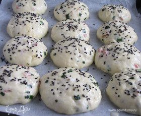 Разогреть духовку до 180 град. Смешать желток с 1 ст. л. воды, смазать булочки и посыпать кунжутом. Поставить в духовку на 15-20 минут.