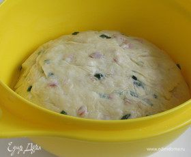 Скатать тесто в шар, смазать оливковым маслом. Накрыть миску пищевой пленкой и оставить тесто в теплом месте на 1 час. Обмять тесто и оставить для еще одного подхода, 45 минут.