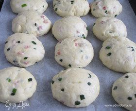 Разделить тесто на кусочки размером с яйцо и скатать из них шарики. Застелить противень бумагой для выпечка, смазанной маслом. Положить булочки,накрыть полотенцем и оставить на 30 минут.