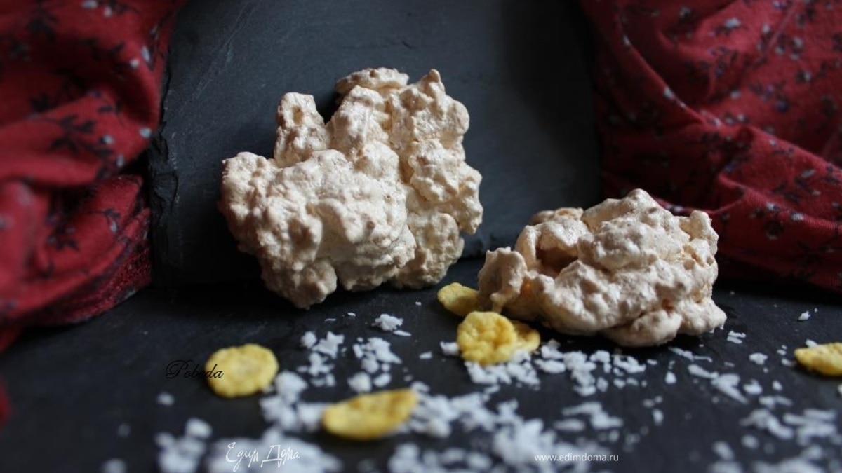 Хрустяшки из готовых кукурузных хлопьев! Воздушные, хрупкие, хрусткие, с ароматом кокоса и ванили!! Исчезают одна за одной. Рецепт у меня был на примете очень давно. Но в оригинале шел с изюмом. Я же (как обожатель кокоса) заменила его кокосовой стружкой, уменьшила количество сахара и получила невероятную вкусность)) Особенно для любителей похрустеть! Прекрасный способ утилизации белков! Кукурузные хлопья можно взять сладие, тогда количество сахара уменьшаем в 2 раза.