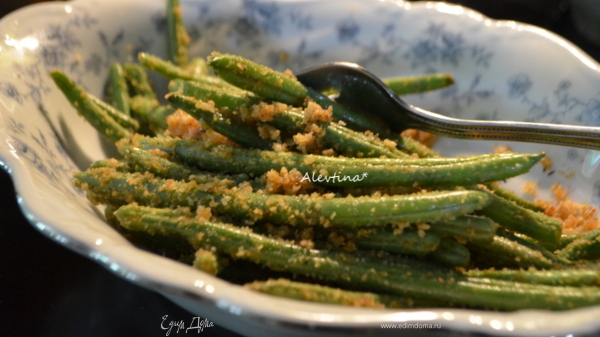 Кончики у фасоли отрезать с обеих сторон. Хлебные сухарики измельчить в крошку, смешать с пармезаном.