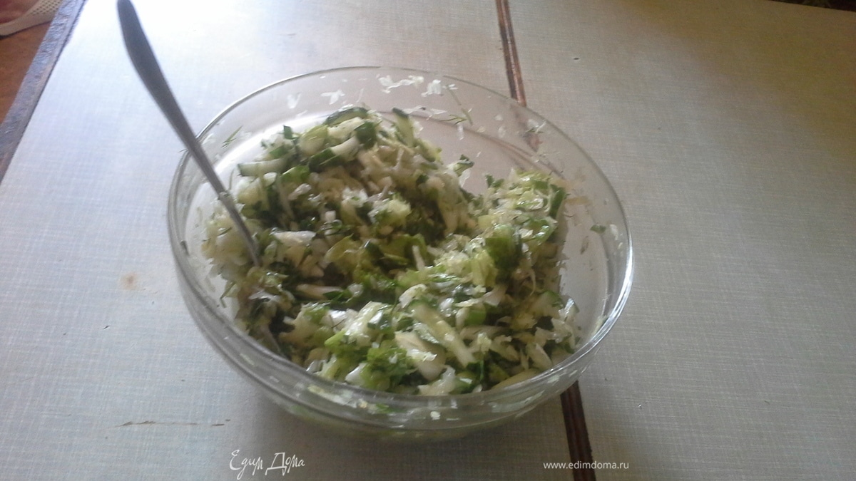- Шаг 1Для салата достать салатницу. Сначала нашинковать капусту, посолить и помять так, чтобы выделился сок. Затем порезать огурцы и редиску брусочками, а лук, салат, зелень - кружочками. Переложить в салатницу, посолить, заправить оливковым маслом и хорошо перемешать. Подавать на стол. Приятного аппетита!
