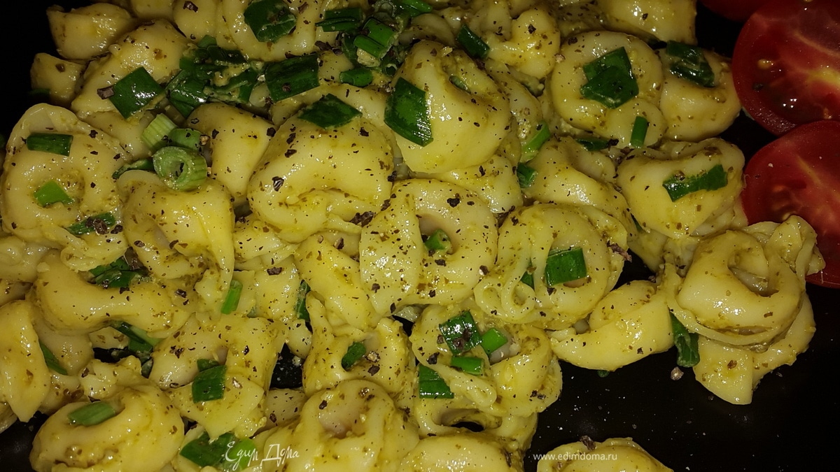 Откидываем готовые тортеллини на дуршлаг. В кастрюльку, в которой они варились, выкладываем соус песто и сразу добавляем тортеллини. Аккуратно перемешиваем, добавляем зеленый лук, накрываем крышкой и прогреваем на медленном огне 2 минуты. Сразу же подаем. - Шаг 3