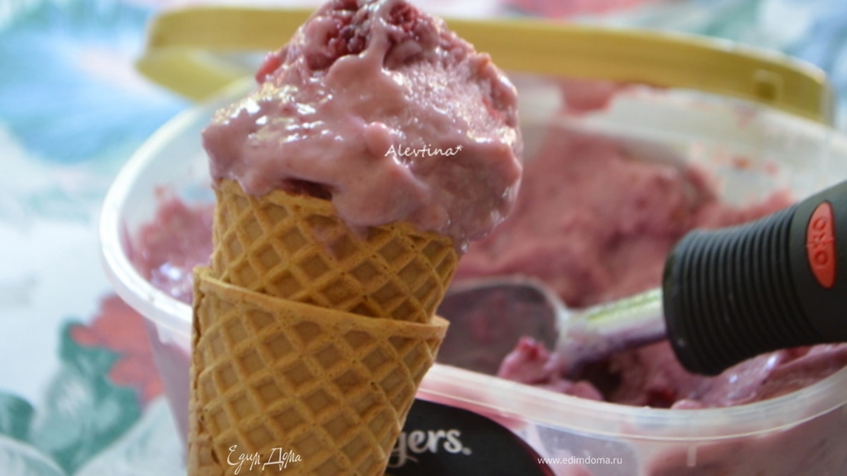По рецепту затем добавляют в мороженицу+вторую часть ягод с сиропом и готовят по указанным инструкциям. Я смешивала вручную, выложив все в контейнер закрытый. Несколько раз мешала вручную за 4 часа заморозки.