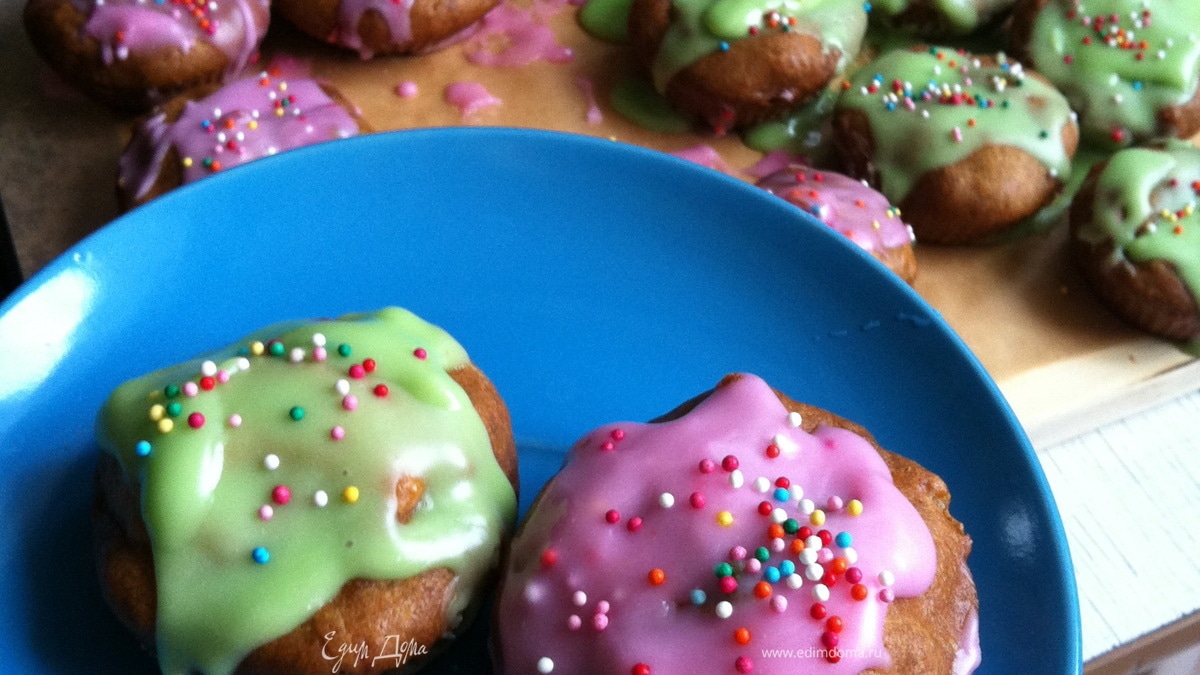 Достаём маффины из духовки, готовим глазурь (я использовала глазурь готовую сахарную "Dr Oetker"). Сахарную пудру смешиваем с молоком (если вы хотите густую глазурь, то добавляйте молока меньше), добавляем по желанию пищевой краситель любого цвета! Поливаем глазурью наши чудесные маффины и посыпаем кондитерской посыпкой. - Шаг 4