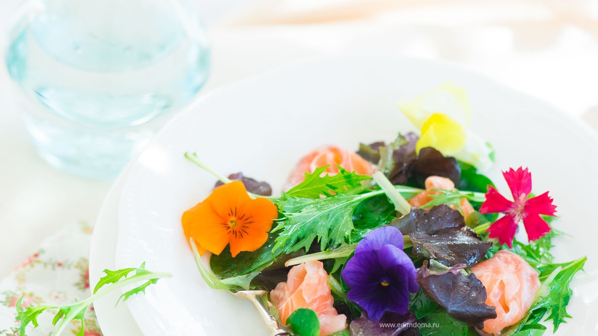 Овощной салат с цветами и лаймовым лососем