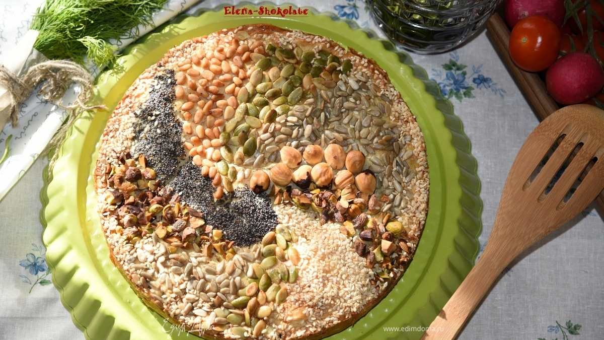 Оставив небольшие бортики, излишки теста срезать. Бортики смазать взбитым яйцом. Вторую часть теста раскатать в круг, равный форме, и уложить сверху. Края защипнуть. Смазать пирог взбитым яйцом и щедро посыпать орехами, семечками, маком, можно в виде рисунка. Острым ножом сделать несколько проколов теста до начинки для выхода лишнего пара! - Шаг 10