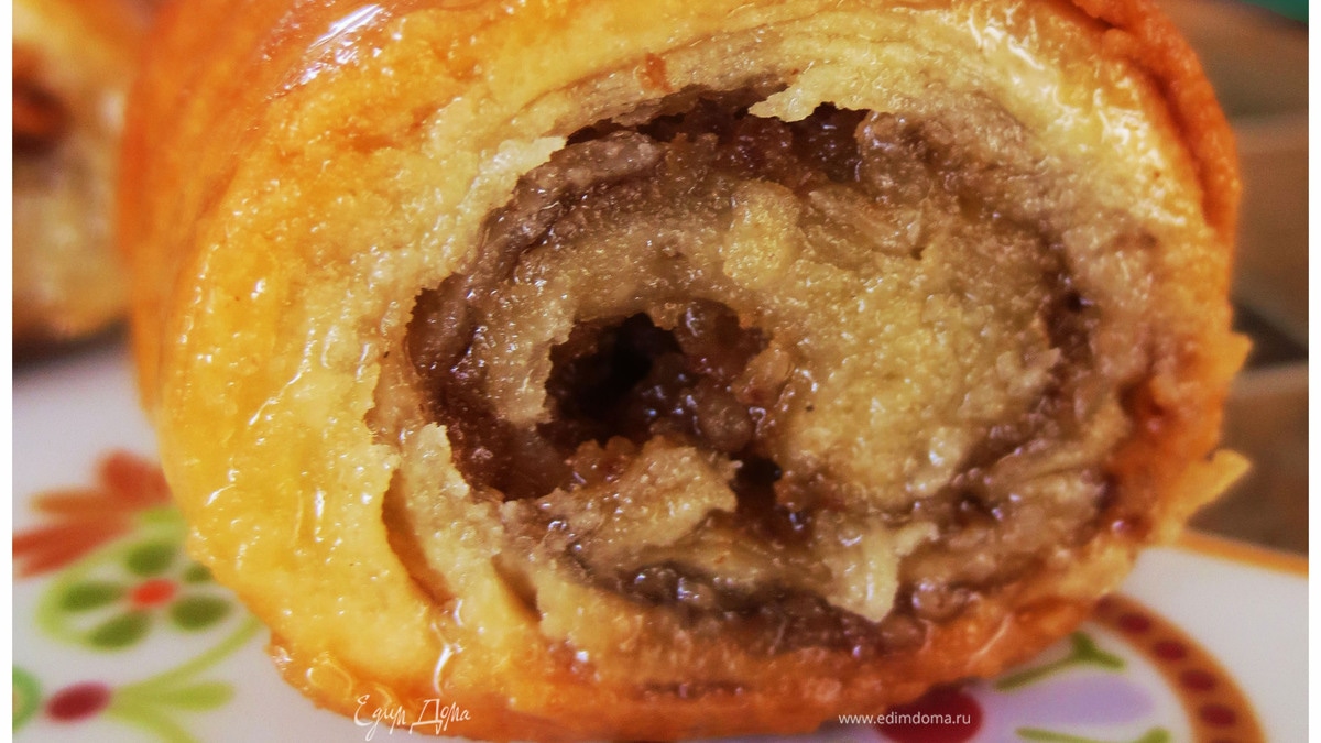 Противень застелить бумагой для выпечки. Положить рулеты. Яичный желток взбить с 1 ч. л. воды и смазать поверхность рулетов. Выпекать в разогретой до 200 градусов духовке 10 минут. Затем снизить температуру до 180 градусов. Перед тем как продолжить выпекать нужно смазать рулеты оставшимся растопленным сливочным маслом и потом продолжить выпекать еще 40 минут. - Шаг 13