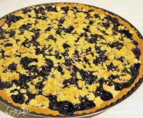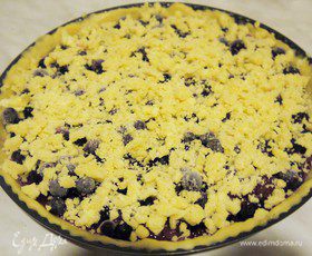 Раскатываем тесто, можно прямо в форме распределить тесто руками, обязательно сделать бортик. Намазываем тесто джемом. Сверху кладем ягоды. В этот раз у меня замороженная черная смородина. Если ягода кислая можно увеличить количество сахара в посыпке. Посыпаем крошкой и выпекаем в разогретой духовке 45-50 мин при t 180С.