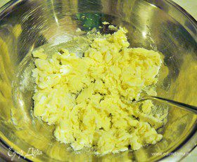Размягченное сливочное масло смешиваем с сахарной пудрой. Добавляем в полученную смесь яйцо и тщательно размешиваем.