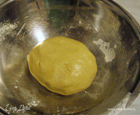 В масляно-яичную смесь всыпаем муку и замешиваем тесто. Заворачиваем в пленку и убираем в холодильник на 1 час.