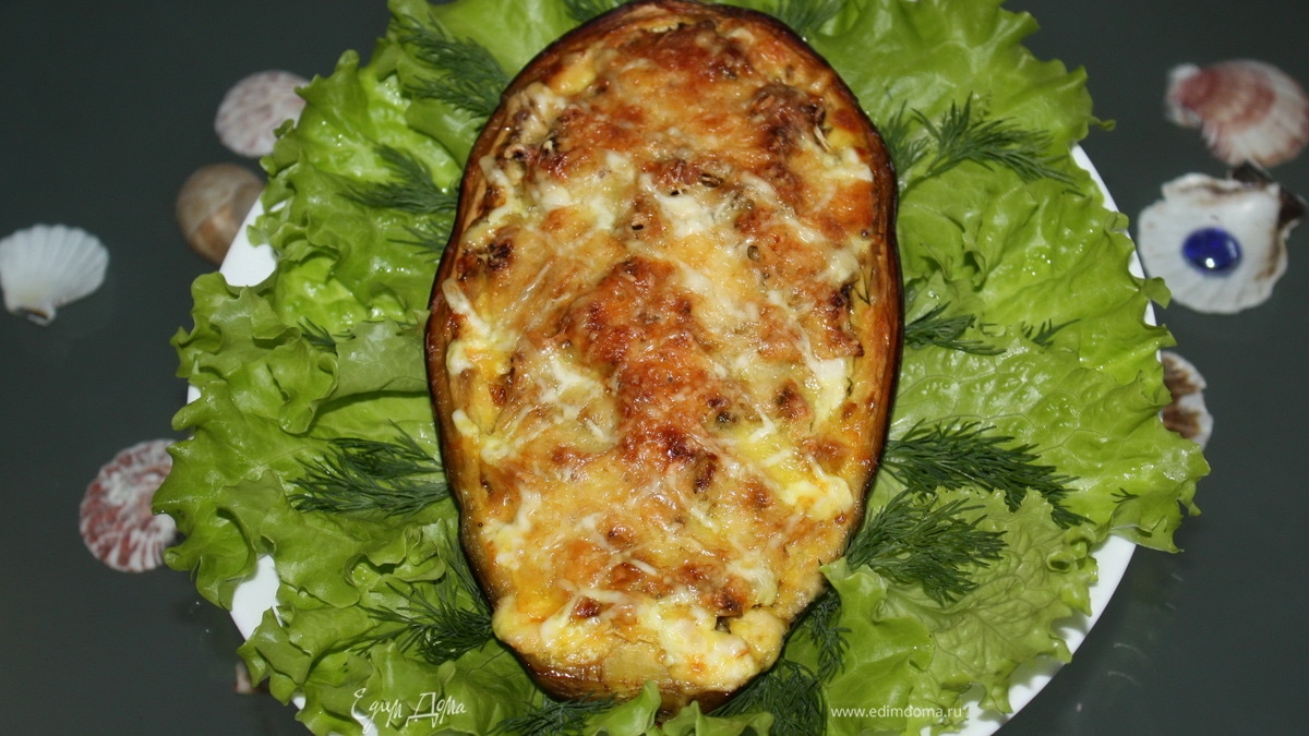 Поливаем готовой заправкой начинку и присыпаем натертым пармезаном. Оставшимся майонезом делаем сеточку на сырной поверхности, ставим в раскаленную духовку до 200°C на 30 минут. Баклажаны должны зарумяниться сверху, а сыр расплавиться. Даем баклажану полностью остыть. - Шаг 12