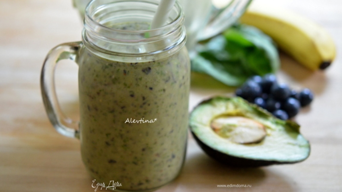 Молодые листья шпината помоем, сложим в блендер, а также очищенную от ядра и кожуры половинку авокадо, очищенную голубику, банан, воду, семена чиа, мед и колотый лед. - Шаг 1