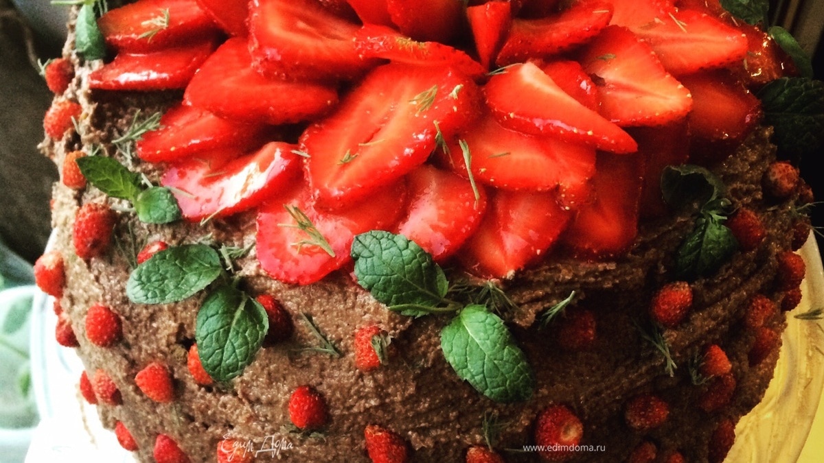 Для глазури опять же всё пробиваем в блендере до той же самой однородной массы. Фанатикам можно заменить какао на порошок Кэроба. Я делаю микс, у кэроба очень приятный вкус и аромат. Миндаль замоченный можно заменить. Кленовый сироп заменяется строгими веганами и сыроежками сушеными инжирами или финиками, густоту тогда модерируйте (это сладость, и все зависит от степени принципиальности веганства, если вы просто ради вкусного торта стараетесь, тогда забейте и добавьте вместо сиропа продукт эксплуатации пчёл:) Достаем нашего Снегурка и со всех сторон жирно наряжаем глазурью. Клубника, мята, земляника, мята )