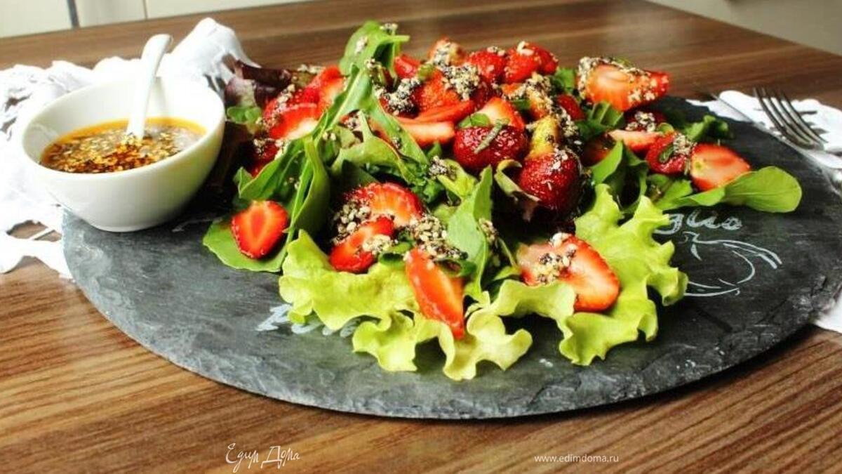 Клубнику перемешиваем с луком. Выкладываем салатный микс на блюдо (при желании рвем листья руками), клубнику с луком и поливаем соусом. Слегка перемешиваем и немедленно дегустируем! Приятного аппетита!