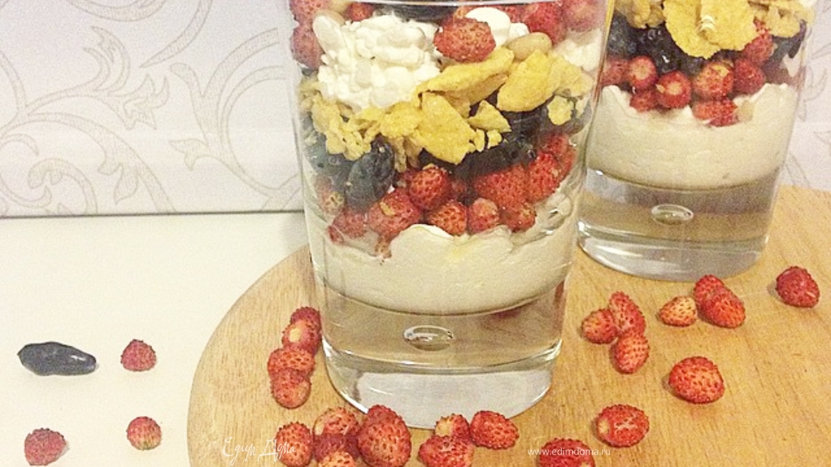 - Шаг 1Количество слоёв зависит от высоты вашего бокала. Сверху полейте еще ложечкой меда и присыпьте орешками. Хлопья дадут хрустящую составляющую. А зерненый творог немного солкости. Ягоды замените на любые сезонные или фрукты! Полный восторг!