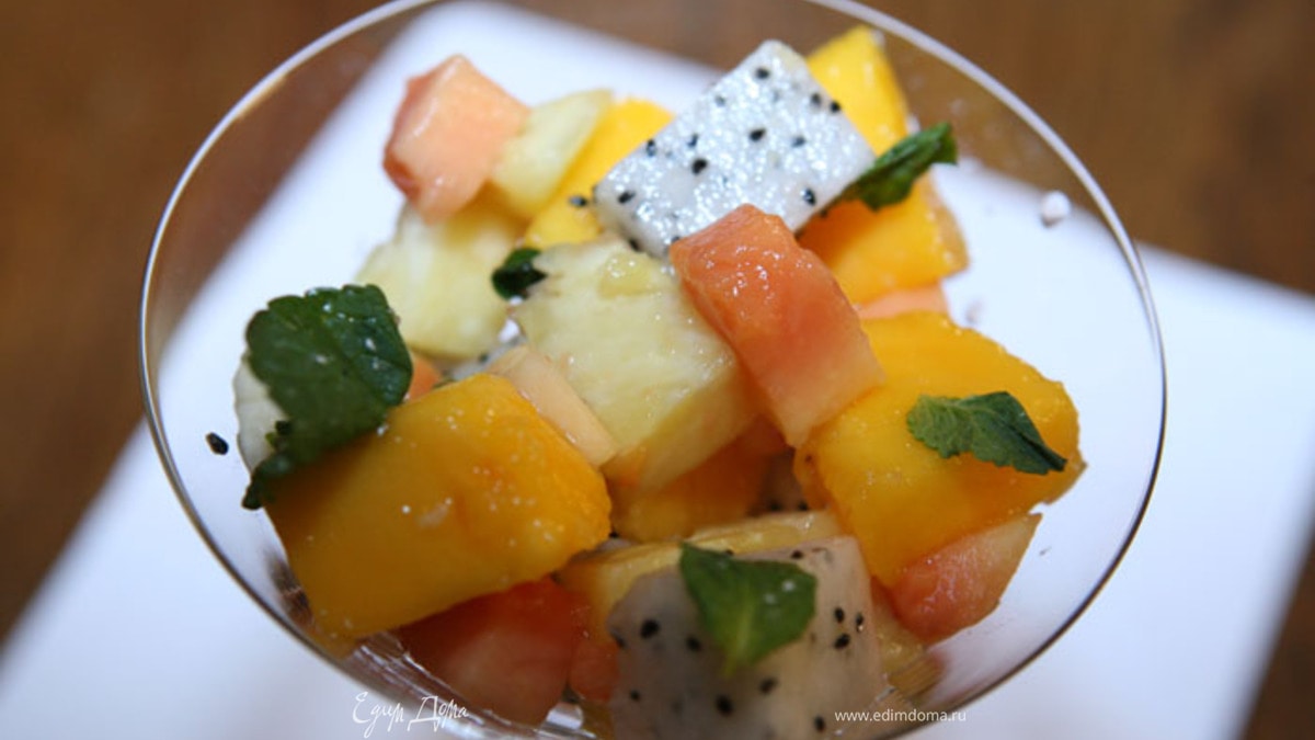 Ананас, манго, банан, папайю и фрукт дракона почистить, нарезать кубиками и выложить в салатницу. - Шаг 1
