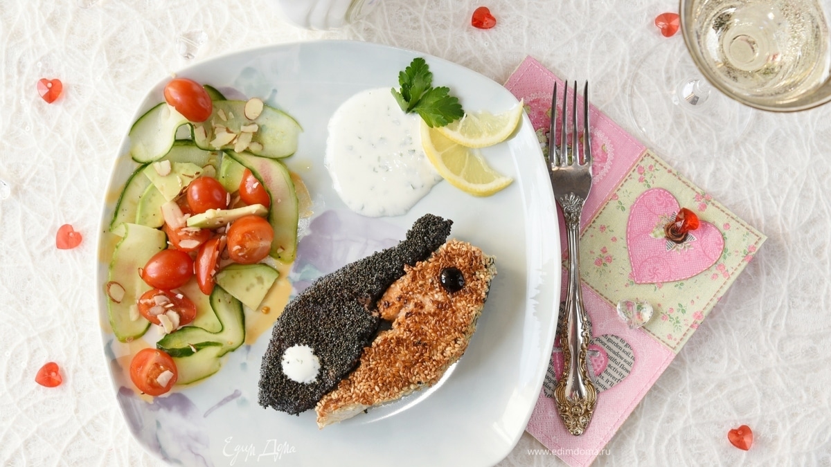Рыбные стейки, запанированные в маке и кунжуте, слегка обжаренные и дополненные освежающим йогуртовым соусом. Подаём с лёгким овощным салатом и бокалом белого вина. И если панировка из кунжута достаточно знакома и всеми любима, то маковая «корочка» смотрится необычно и по-новому. Придадим рыбке узнаваемый символ «Инь-Янь» и прекрасное настроение на вечер Вам обеспечено!