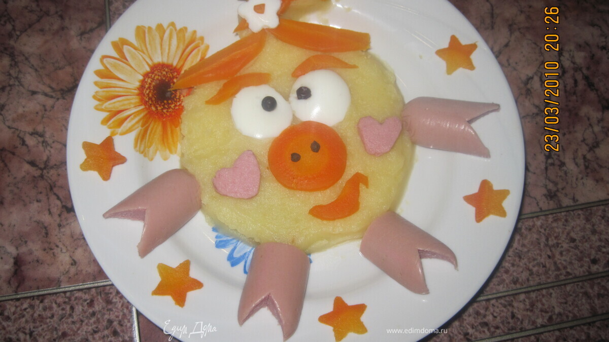 - Шаг 1Туловище - картофельное пюре. Косичка - пюре+морковь Цветок на косичке - из белка яйца Глаза - белок яйца Зрачки - душистый перец Нос, рот - морковь Ноздри - черный перец Щечки-сердечки - из сосисок Лапки - сосиски