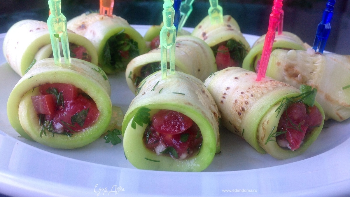 Начинка: мелко режем 1 большой помидор, добавляем мелко порезанный чеснок, маленький кусочек красного чили, петрушку, укроп, добавляем туда соль, сок лимона и оливковое масло, перемешиваем и заворачиваем в кабачки, закрепляем зубочистками или вот такими шпажками как у меня. - Шаг 2