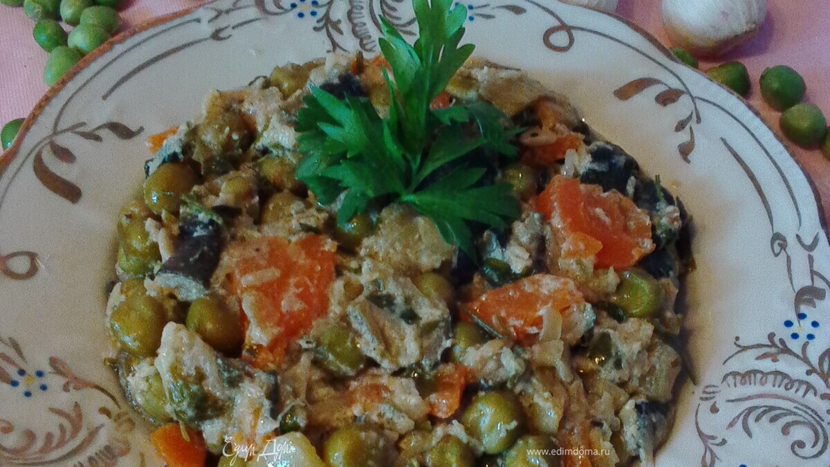 Все овощи помещаем на сухую (!) сковороду (кабачки и лук кубиком, морковь кружочками, горошек очищен от "футляра") на средний огонь, готовим под крышкой почти до мягкости. - Шаг 1