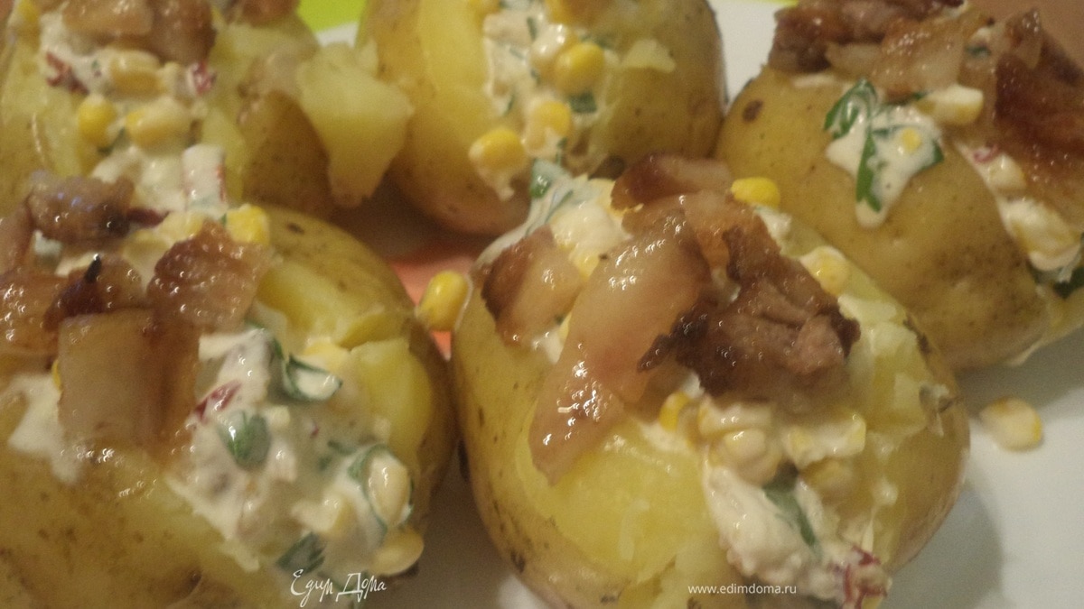 Горячий картофель вынуть из фольги, сделать по картофелине продольный надрез, в надрез положить столовую ложку начинки, посыпать кубиками бекона.
