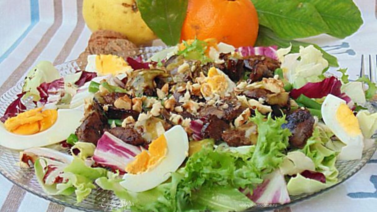 Теплый салат с печенью и апельсиновым соусом