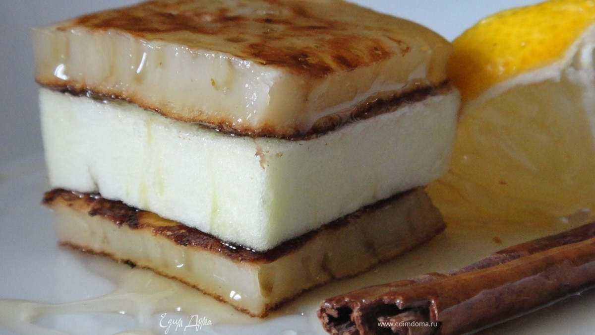 Когда все остыло, начинаем собирать пирожное. Выкладываем на тарелку одну подложку из оладьи, смазываем ее медом, выкладываем сверху цукини, смазываем его медом и накрываем второй подложкой. Обрезаем концы и придаем форму нашему пирожному. Украшаем медом, корицей и лимоном. Приятного аппетита.