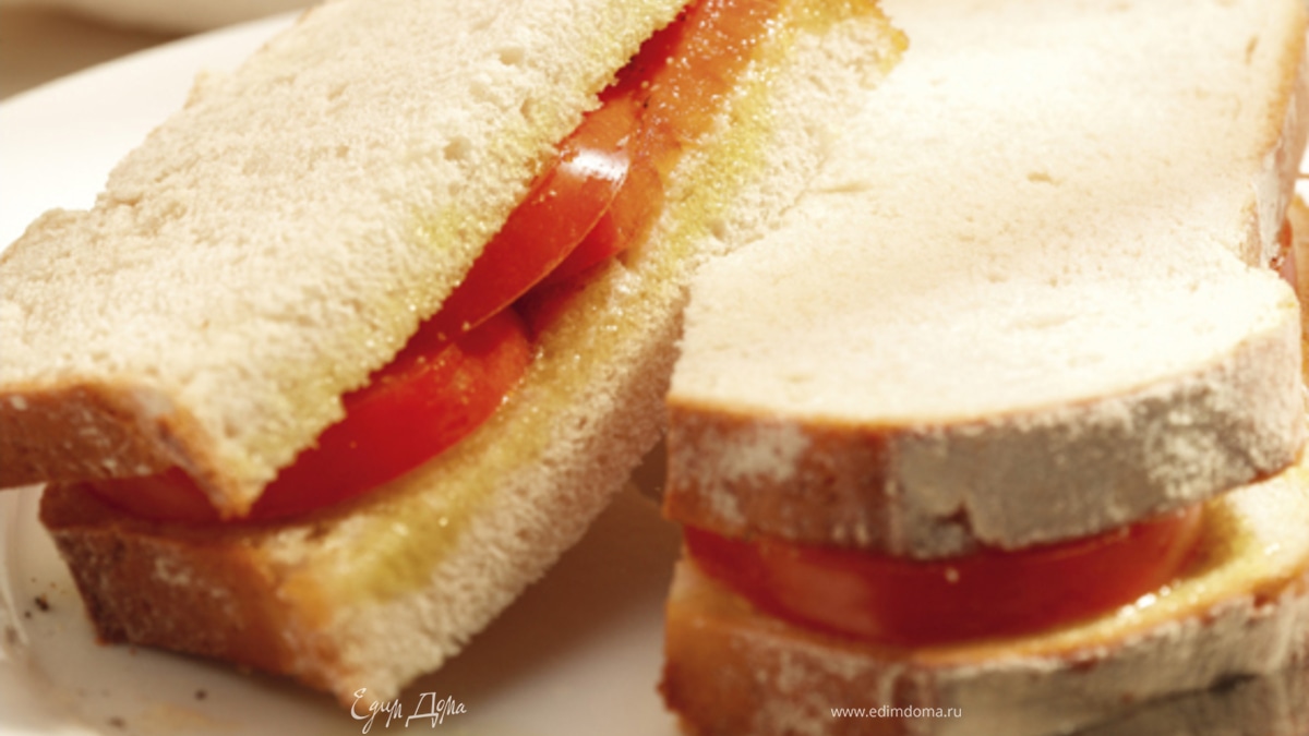 - Шаг 1Выложить на один из ломтиков хлеба помидоры и посолить. Накрыть вторым ломтиком хлеба и подавать.