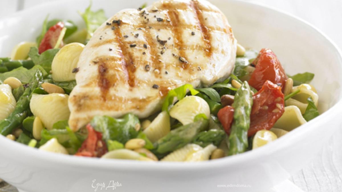Отбросить ракушки на дуршлаг, затем переложить обратно в кастрюлю. Крупно порубить рукколу и добавить к пасте вместе со спаржей, помидорами и кедровыми орешками, заправить взбитой ранее смесью и тщательно перемешать. Выложить пасту на 4 порционные тарелки, а сверху положить куриные грудки. Если вы придерживаетесь вегетарианской диеты, можно заменить куриные грудки кубиками моцареллы.