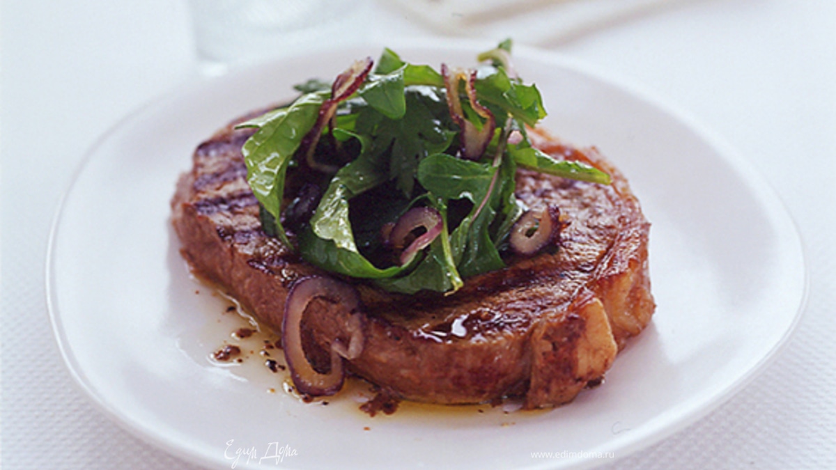 - Шаг 3Выложить готовые стейки на 4 горячие порционные тарелки, украсить сверху салатом и сразу подавать.