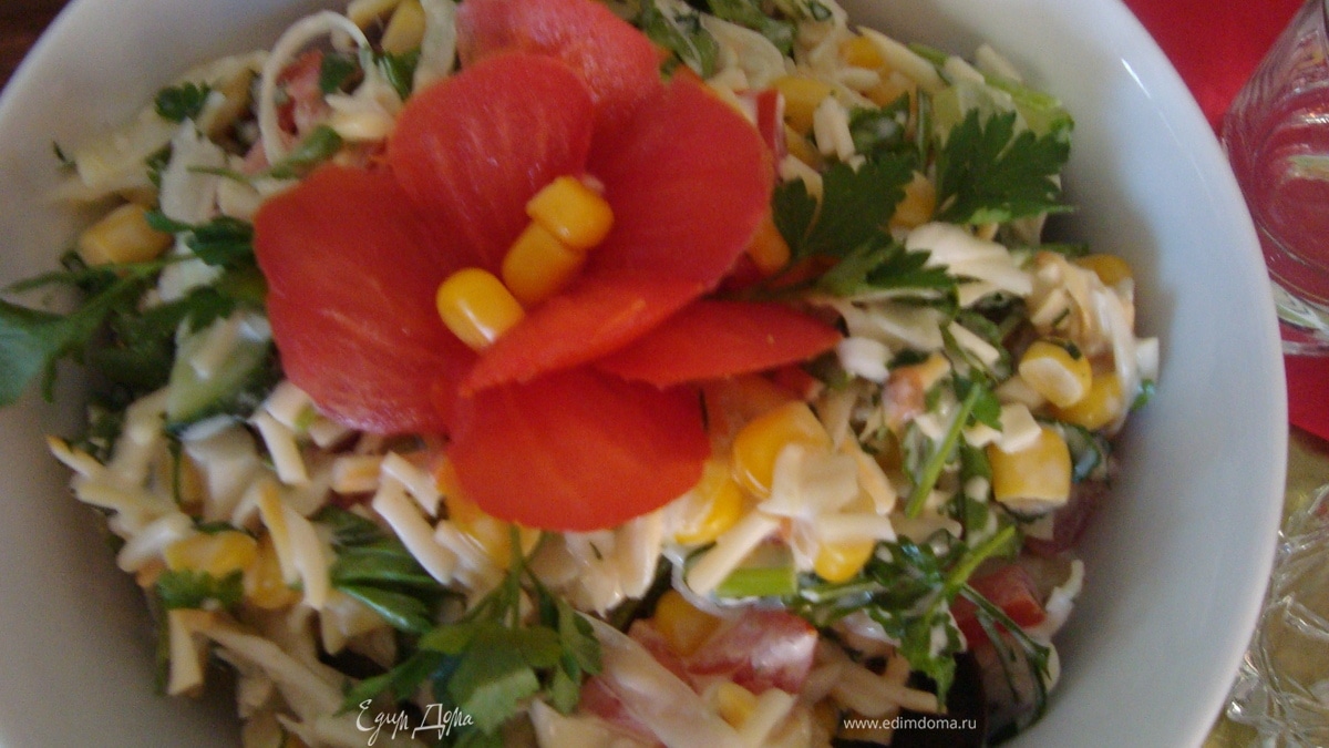 - ПодготовкаСыр и рыбу нарежьте тонкими ломтиками.Маслины и сладкий перец соломкой.Один початок кукурузы оставьте на оформление салата,второй разрежьте на кусочки. Смешайте лимонный сок.масло,горчицу и каперсы.залейте подготовленные продукты и осторожно перемешайте.Подавайте на листьях зеленого салата,оформите зеленью и кукурузой.