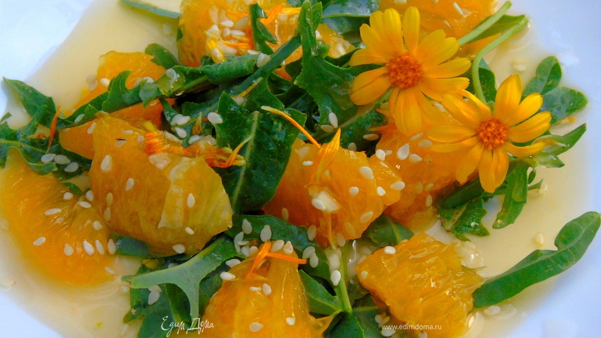 Руколу перемешать с апельсином, полить заправкой и присыпать кунжутом. Украсить цветами календулы. Приятного аппетита!