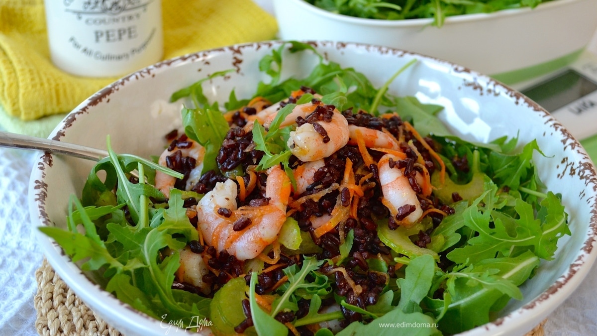 Салат с черным рисом Венере и креветками