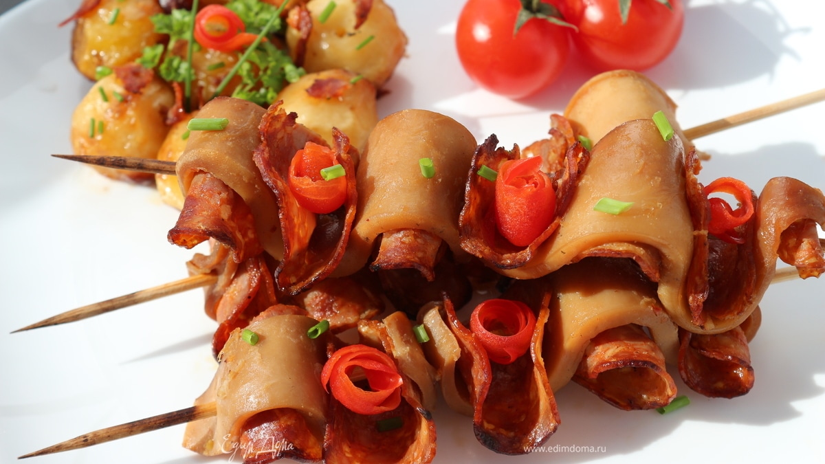 Чоризо тонко порезать. Нанизываем кальмара вместе с чоризо на шпажки. Шпажки предварительно замочить в воде. Готовим на гриле не более 2-х минут с каждой стороны.