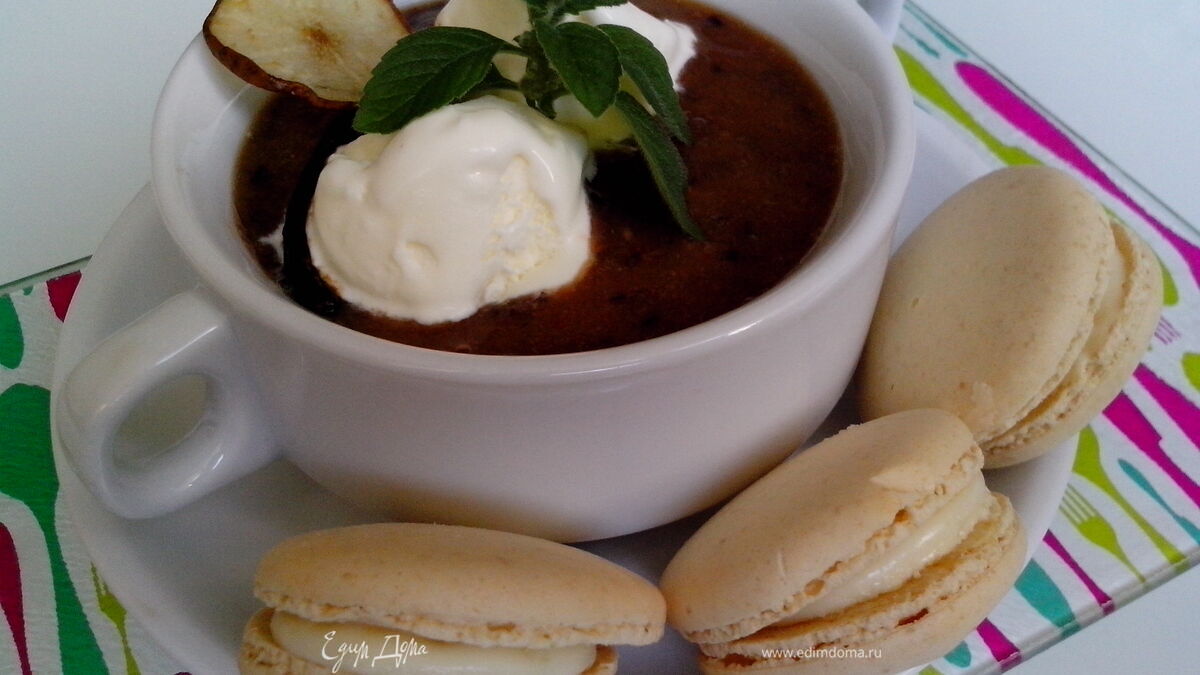 Перелить в порционные тарелки, сверху украсить шариком ванильного мороженого, веточкой мяты. И подавать с хрустящими грушевыми чипсами! Приятного аппетита! К этому летнему десертному супу идеально подойдут ванильные Macarons!