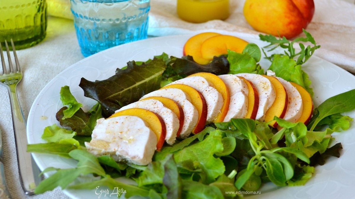 Сервировать салат, выложив на тарелку листовой салат. Сверху выложить чередуя ломтики куриного мяса и нектарины. Полить все приготовленной заправкой и подавать!