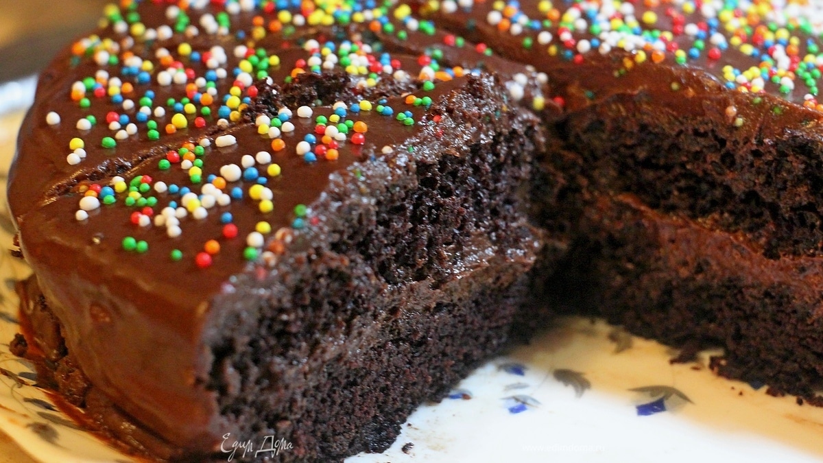 - ПодготовкаГотовим тесто. Отдельно смешиваем сыпучие продукты: муку, соль, соду пищевую, какао-порошок. Отдельно — растительное масло с сахаром. Добавляем лимонный сок и воду. Взбиваем миксером до полного растворения сахара. Затем в сухую смесь вливаем жидкую и тщательно перемешиваем с помощью миксера или венчика. Разогреваем духовку до 180°С. Форму для выпечки смазываем сливочным маслом и слегка присыпаем мукой или манной крупой. Выливаем тесто и выпекаем 40–45 минут.