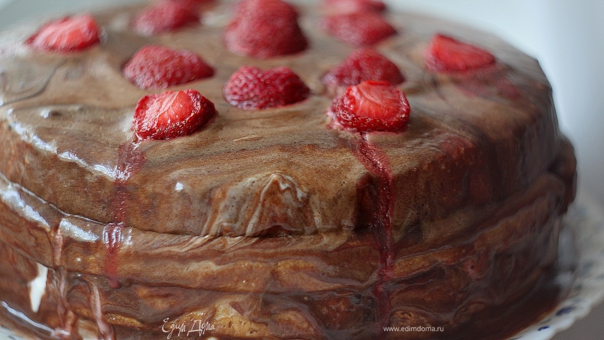 Высокий бисквитный торт с клубникой и "мраморной" глазурью