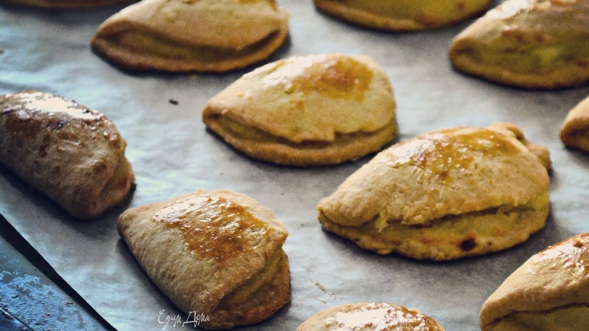 - Шаг 3Раскатать тесто, вырезать стаканом формочки. На половинку каждой формочки выложить начинку и накрыть второй половинкой.