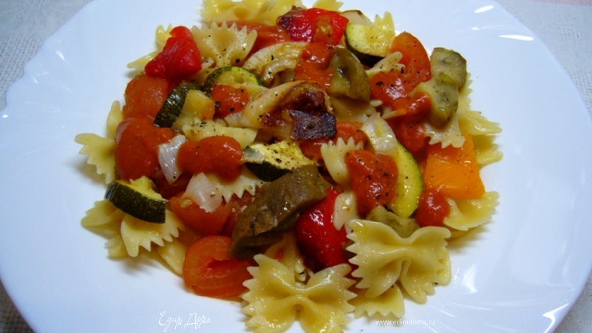Необыкновенно вкусный постный салат! Теплые запеченные чуть сладковатые овощи, ароматная острая холодная заправка, ну и конечно супер-вкусные фарфале!