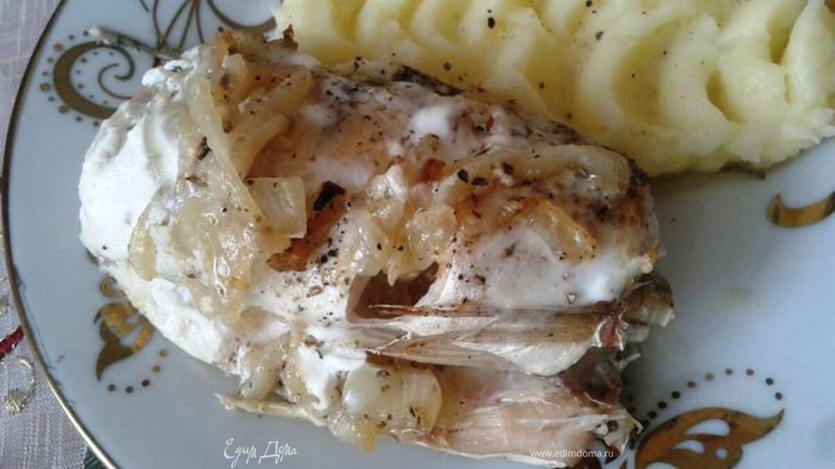 Судак, запеченный с луком в сметане