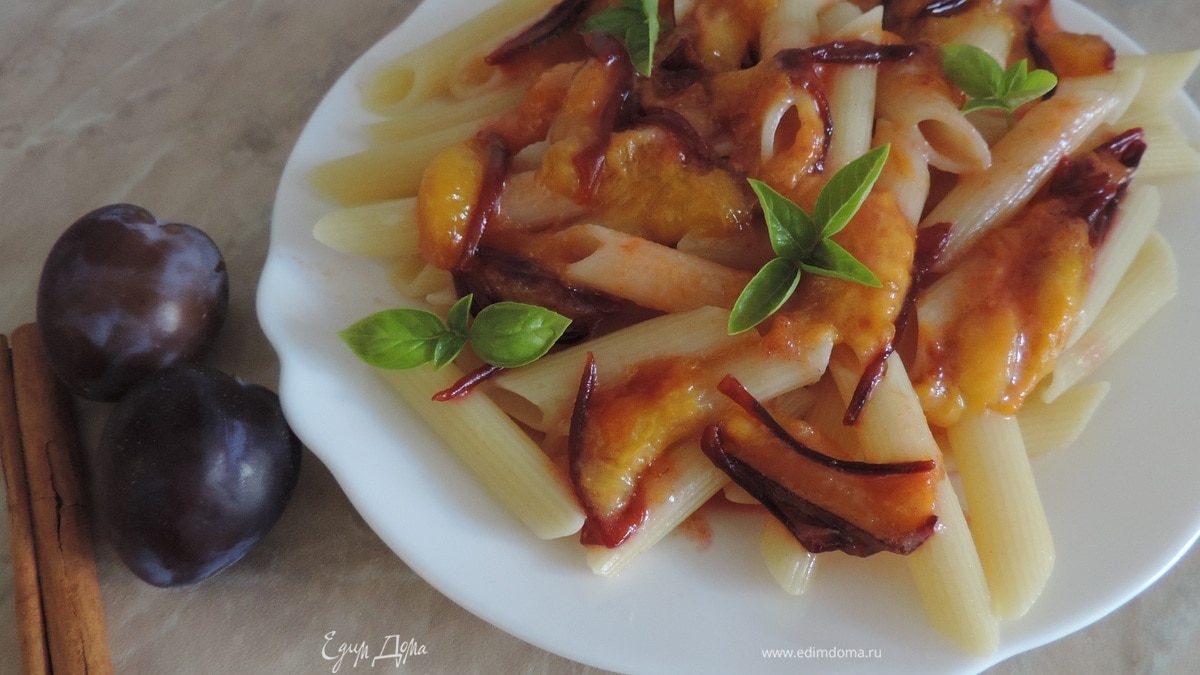 - Шаг 3Сливаем воду с пасты, раскладываем ее по тарелкам. Сверху выкладываем сливы и поливаем образовавшимся на дне сотейника соусом. Украшаем листиками свежего зеленого базилика (фиолетовый слишком резкий для фруктов).
