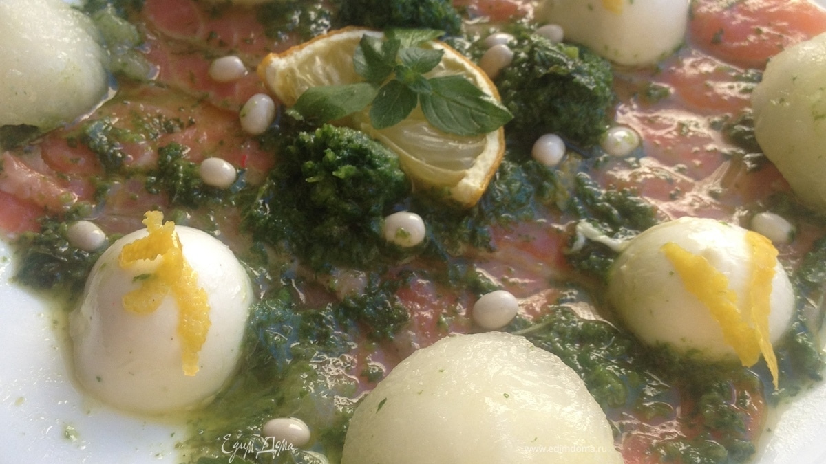 Карпаччо из форели с дыней, моцареллой и мятным песто
