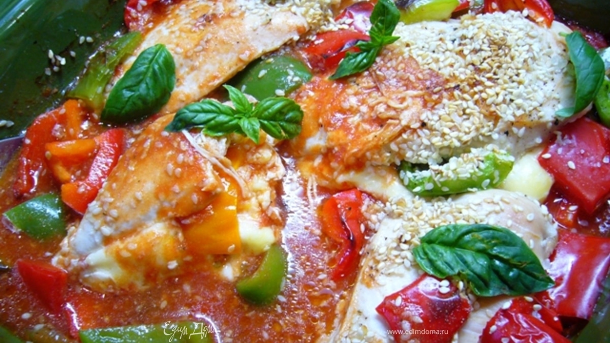 Подготовленную грудку выложить в емкость для запекания, присыпать кунжутом, сверху – перец. Духовку разогреть до 220 град. Запекать 15 мин. - Шаг 5