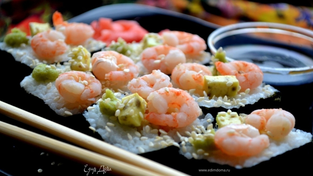 Украшаем каждый ролл креветками, авокадо, васаби, посыпаем кунжутом. - Шаг 12